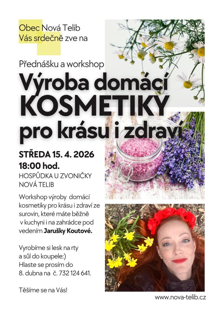 Obec Nová Telib Vás srdečně zve na workshop „Výroba domácí kosmetiky pro krásu i zdraví“, který se uskuteční ve středu 15. 4. 2026 od 18:00 hodin v Hospůdce U Zvoničky v Nové Telibi.